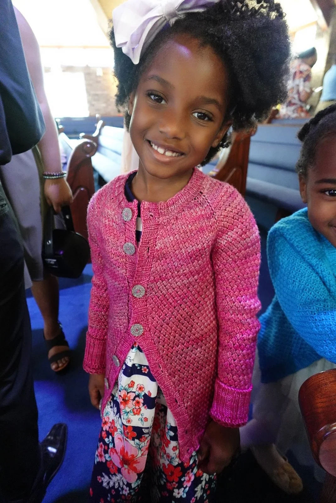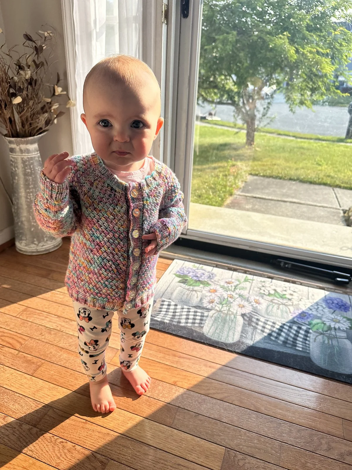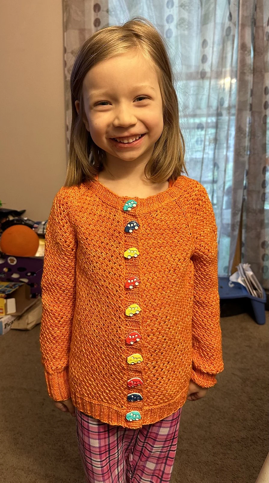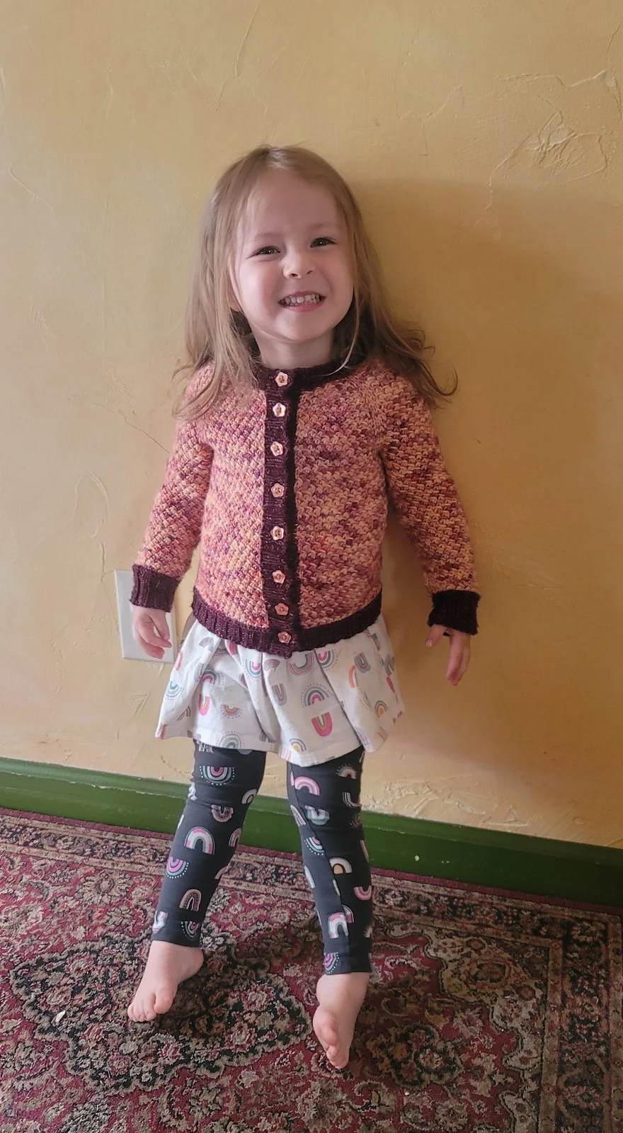 Time flew, and before I knew it, her baby was a toddler. But once I had the idea and the perfect yarn, everything clicked into place. The knitting flew by in less than a month because every stitch felt like a celebration of this special little girl. When I finally saw her wearing it—running around, playing, and completely living in it—I knew I’d made something truly special.